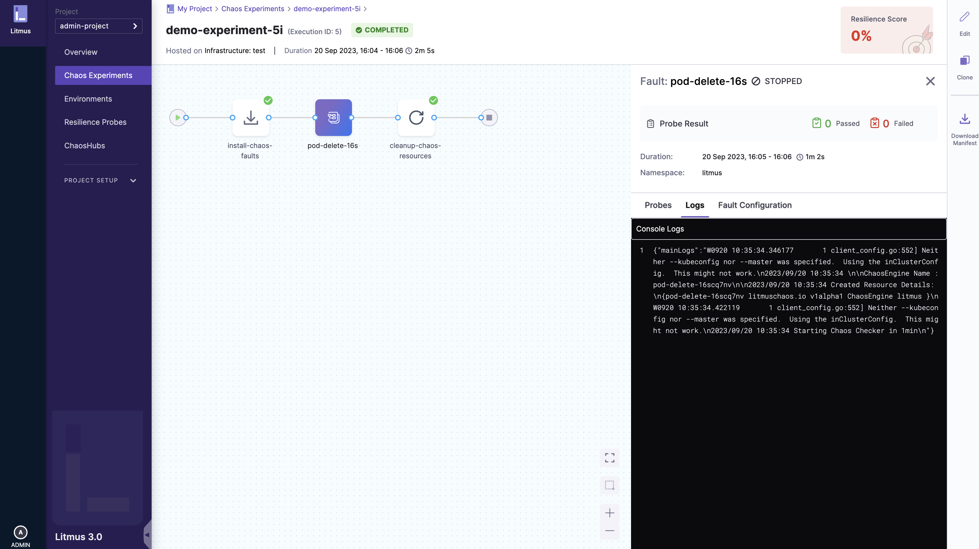 With ChaosCenter, the real-time data and status of the chaos experiments can be observed. Valuable information like pod logs, chaos experiment status, and chaos results can also be viewed.